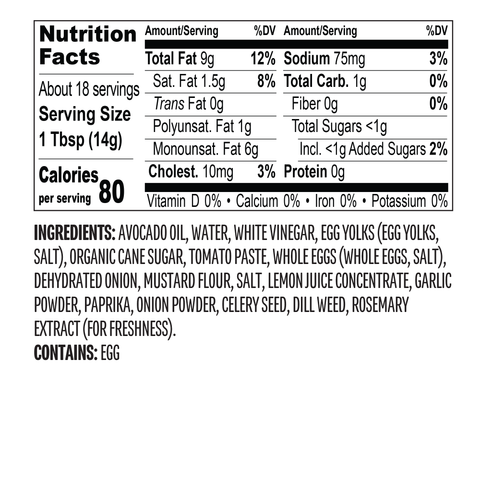Everything Bagel Sauce: Avocado Oil, Water, White Vinegar, Garlic, Egg Yolks (Egg Yolks, Salt), Organic Cane Sugar, Whole Eggs (Whole Eggs, Salt), Roasted Garlic Puree (Roasted Garlic, Citric Acid), Dehydrated Onion, Garlic Powder, Garlic, Molasses, Poppy Seed, Mustard Flour, Onion Powder, Salt, Lemon Juice Concentrate, Black Pepper, Rosemary Extract (For Freshness).