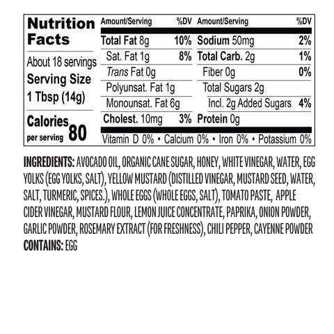 Chicken Sauce: Avocado Oil, Organic Cane Sugar, Honey, White Vinegar, Water, Egg Yolks (Egg Yolks, Salt), Yellow Mustard (Distilled Vinegar, Mustard Seed, Water, Salt, Turmeric, Spices), Whole Eggs (Whole Eggs, Salt), Tomato Paste, Apple Cider Vinegar, Mustard Flour, Lemon Juice Concentrate, Paprika, Onion Powder, Rosemary Extract (For Freshness), Chili Pepper, Cayenne Powder.